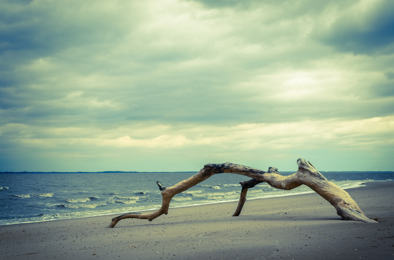 A landscape photograph of driftwood on a beach cove in Woodland beach Delaware on a heavily overcast day. This section of the beach is only accessible at low tide.
